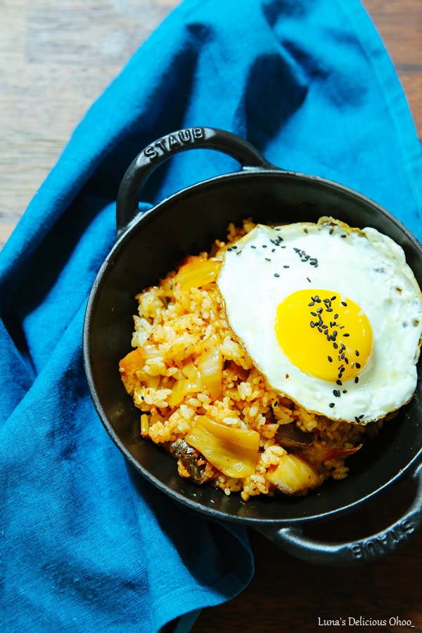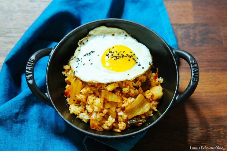 김치 15g 해바라기씨 기름 1/2tsp 파 1tbsp 간장 1/4tsp 나트비아 1/8tsp 고춧가루 1/4tbp 삶은 밥 70g- 귀리 20g- 흑미 10g 계란 1개 슬라이스 치즈 1/2장