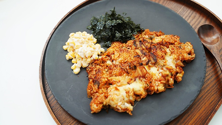 대신 고춧가루는 넉넉히 넣어야 맵게 먹을 수 있을 것 같아.요즘은 레시피 양보다 조금 많이 넣곤 하는데 고춧가루를 넣으면 조미료가 수분을 머금고 순식간에 푸석푸석해질 수 있기 때문에 이 부분은 조심하는 것이 좋다.백종원의 김치밥 레시피 그대로 밥과 양념장을 섞는다.제가 준비한 것은 잡곡밥 약 80g 분량으로 귀리, 흑미, 현미 3가지를 넣고 끓인 것이기 때문에일반적인 백미에서 볼 수 있는 밥의 끈기는 전혀 없고 알갱이로 따로 노는 것을 볼 수 있는데, 이것으로는 밥을 구워 모양을 낼 수 없다.그래서 여기에 달걀 한 개를 넣고 섞어 부족한 단백질도 보충하고 밥을 서로 연결할 수 있는(?) 것으로 활용하는 한마디로 밥전 같은 느낌이라고 생각하면 된다.이제 보내고 마무리 해주면 돼!기름 없는 팬을 중약불로 데우고 그 위에 버무린 밥을 펼쳐 구운 기름 없이 구울 때 필수 요소는 코팅이 벗겨지지 않은 팬이다.절대 안 붙어.김치밥의 필수요소는 역시 치즈잖아!슬라이스 치즈의 반 길이를 올리고 뚜껑을 덮고 치즈가 녹을 때까지 기다리는 약 2~3분 안에 충분히 녹는다원래 레시피처럼 냉동 모짜렐라 치즈 듬뿍 넣어서 먹으면 당연히 맛있는데…칼로리를 신경써서 먹는 양도 신경쓰고 싶은 사람이라면 냉동 모짜렐라 치즈의 양을 잘 지키면서 넣는지 혹은 어느 정도의 양을 먹었는지 눈으로 확인하기 쉽도록 슬라이스 치즈를 넣는 것이 시각적으로 정확해 보여 식사 관리에 적합하다.그리고 접시에 담으면서 반으로 접어주면 완성이다 이렇게 되면 뜨거운 밥 사이에 치즈가 묻어 쉽게 굳지 않아도 된다.그런데 이것만 먹으면 얼핏 봐도 식이섬유가 부족해 보이는 것은 몰라도 김치밥을 만들었는데 김치를 또 먹어야 할 것 같은 음식이기 때문에 생채소를 조금 곁들여주면 좋다.포만감도 늘려 중간에 채소를 먹는 것이 입을 한 번씩 씻어 먹는 느낌으로 먹기 딱 좋다.칼로리:287.1kcal 단백질:12.5g 지질:9.2g 당질:45.7g칼로리:287.1kcal 단백질:12.5g 지질:9.2g 당질:45.7g
