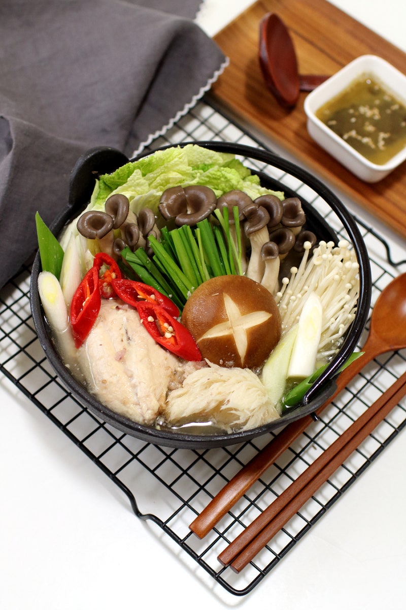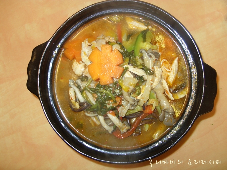 2~3인분의 양이 기준입니다.스프:물800ml, 닭1마리, 표고버섯1~2개, 대파1대, 통후추15개, 마늘5입양념:고추장1T, 고춧가루1T, 초간장1T, 다진마늘1T, 후추톡/참치액1T, 소금냄비재료: 각종 버섯(느타리버섯, 에링기, 팽나무 등), 배추3~4장, 양파반개, 대파백부분1대, 풋고추1개, 깻잎3~4장, 당면교체(취향)
