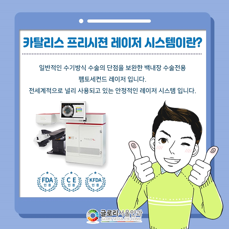 행복 레이저의 카탈레스 시스템은 백내장 치료를 원활하게 지원하는 기기입니다.과거 수기 방식과 달리 정밀한 레이저로 눈을 개선하므로 훨씬 안정적이고 정교한 치료가 가능합니다.또한 눈 손상 우려가 적기 때문에 각막 혼탁이나 각막 부종 등 각막 내피 손상으로 인한 증상이 나타날 확률도 현저히 낮아져 만족도가 높습니다. 또한 개인의 눈 상태를 실시간으로 체크하고 반영하는 시스템을 통해 개선 과정에서 일어날 수 있는 비상 상황까지 제어할 수 있어 보다 효과적인 개선이 이루어집니다.