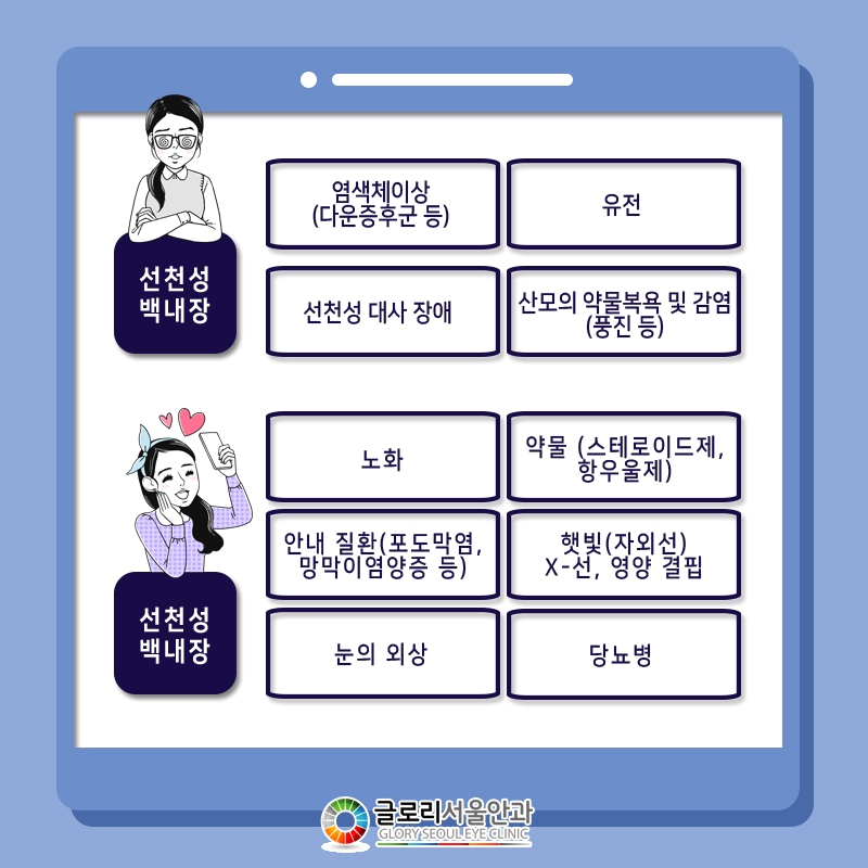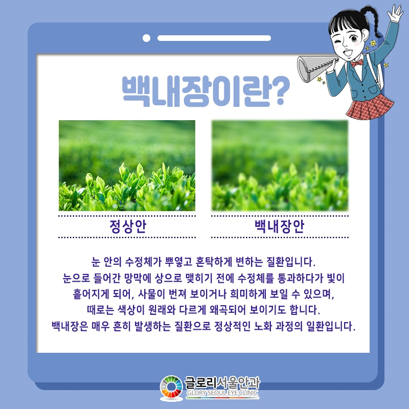 백내장은 국내 3대 실명질환으로 알려져 있을 정도로 실명 위험이 높은 질환 중 하나입니다.따라서 가급적 증상을 빠른 시일 내에 발견하고 그에 적절한 조치를 취하는 것이 좋으나 대부분의 경우 단순 시력 저하 증상과 혼동하기 때문에 빨리 발견하기는 어려울 것으로 생각됩니다.