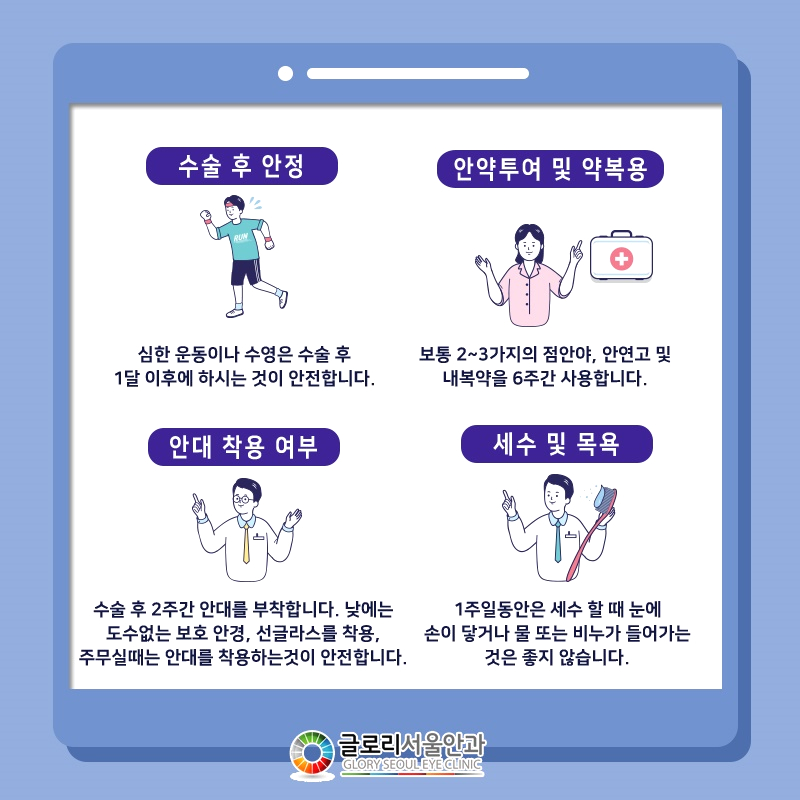 다만 치료를 한 뒤에는 눈이 예민해진 상태이기 때문에 이런 부분을 충분히 고려해야 합니다.평소 음주나 흡연을 즐기던 분들도 이 시기는 눈이 회복되는 시기라고 생각하고, 백내장 수술 후 음주는 가급적 피하십시오.또한 격렬한 운동이나 목욕 등도 1개월 정도는 삼가면서 눈에 걸리는 자극을 줄여 가면 좋겠네요.