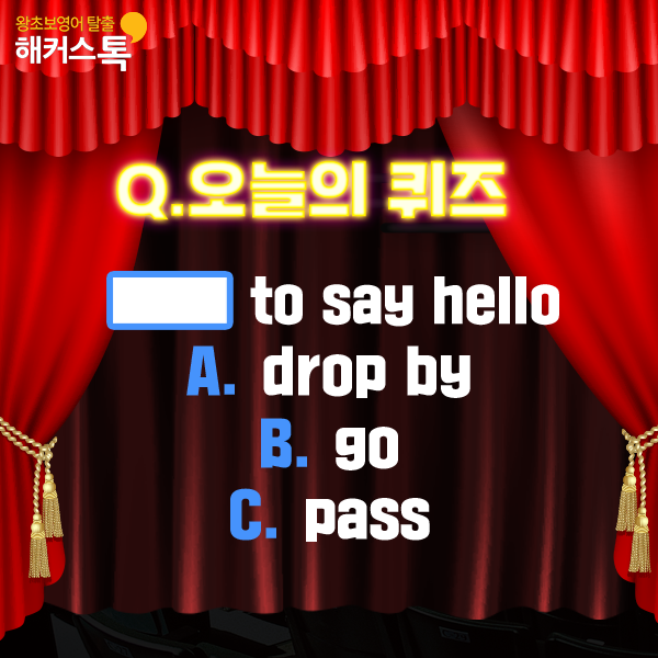 drop by는 ‘들리다’라는 뜻이에요.직역하면 “hello라고 말하기 위해 들렸다” 니까 He just dropped by to say hello는 “그는 인사하기 위해 잠깐 들렀다” 겠죠.