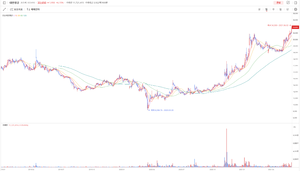 위 영상은 증권방송 전문가 분석해 놓은 향후 전망에 관한 자료입니다.그럼 영상에 이어서 개략적인 주식 정보에 대해 간단히 알아보겠습니다.대한항공 테마는 경영권 분쟁, 인수합병, 여행, 보복, 소비, 수에즈운하 등 다양한 관련주로 분류되는 종목입니다.지난 2021년 4월 2일 기록된 시가총액은 9조4,781억원으로 코스피 36위에 해당하는 규모의 기업입니다.같은 날 집계된 외국인 보유 주식 수는 36,717,594주로 보유율은 21.12%입니다.같은 거래일을 기점으로 52주 내 기록된 주가 중 가장 높았던 가격은 31,950원이고, 가장 낮았던 가격은 11,152원입니다.당일 마감된 시세는 50원으로 전일대비 +27,250원이며, 등락률로는 +0.18%에 해당합니다.장 마감 후 최종 거래량은 1,750,164주이며, 거래대금은 47,675백만원입니다.한편 당일 시가는 27,300원이고 고가는 27,450원이며 저가는 27,150원입니다.