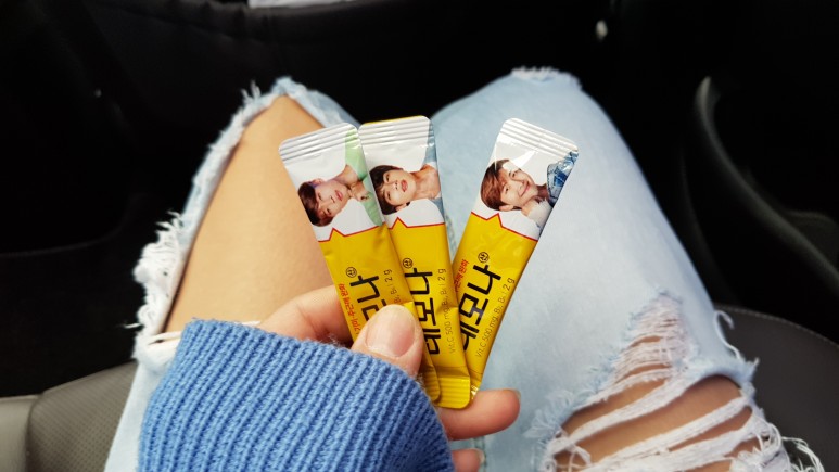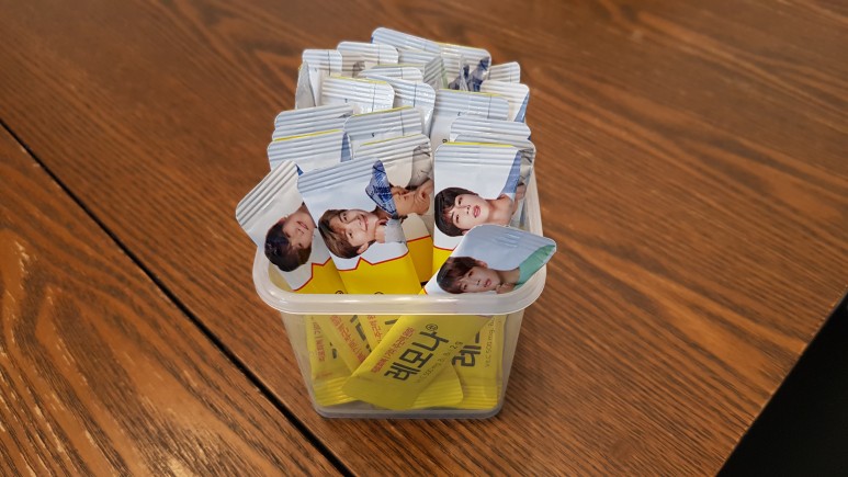 이 스캐너 왼쪽에 테이블이 있습니다만, 거기에 소지품을 빼 두는 장소입니다.반지, 목걸이, 시계를 풀어야 합니다.금속이 감지되면 안 됩니다만, 귀걸이와 브래지어는 괜찮다고 합니다.그 소지품을 빼놓는 테이블에 레모나틴 케이스가 2개 있었는데.하나는 슈가의 얼굴이 프린트 되어있고 하나는 아이유의 얼굴이 프린트 되어있었어요~ 아, 얼마나 우연인지.슈가는 얼마 전 아이유의 신곡 ‘에잇 이잇’ 프듀와 피처링을 했어요.