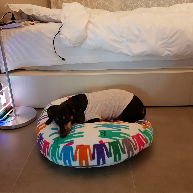 방에서 격리 중. 방문을 열어놓고 있는데 뭔가 좀 쓸쓸해요.강아지는 같이 있어도 된대요.피폭이라는 것은 원래 수십 년 후에 나타나는 것이기 때문에 강아지는 수십 년 살지 않았기 때문에 괜찮다고 합니다.그래서 같이 많이 있었어요.방사능이 나오는 방인데도 아무것도 모르는 요미는 밝고 위험구역에 드나든다.
