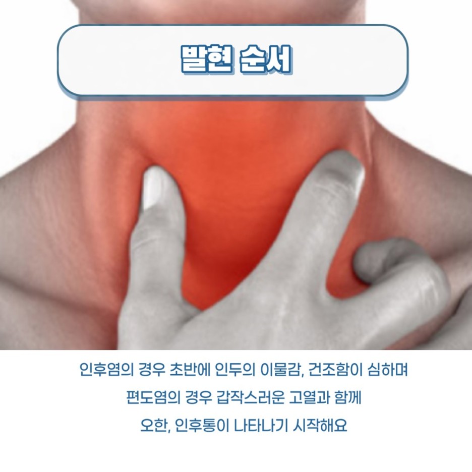 편도염과 인후염 급성 편도염의 경우 일반 감기와 증상이 비슷하며 갑자기 발생하는 고열과 오한, 음식을 삼킬 때 발생하는 심한 인후통이 특징입니다.