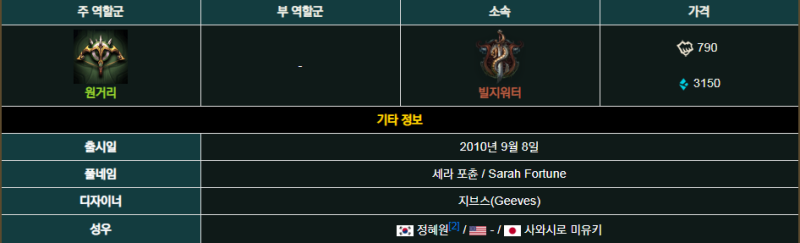 “감수할 위험이 클수록 현상금도 많아집니다.” 빌지워터의 선장 세라포춘은 미모로도 유명하지만 무자비한 일처리 때문에 공포의 대상이기도 합니다. 틀에서 찍은 것처럼 같은 빌지워터 범죄자들 사이에서 그녀는 단연 돋보이는 존재입니다. 어린 시절 자신의 가족이 해적왕 갱플랑크에게 살해되는 것을 목격했고 세월이 흐른 뒤 갱플랑크가 타고 있던 기함을 불태움으로써 잔혹한 복수극을 완성했습니다. 사라 포춘을 과소평가하면 그 매력에 숨겨진 예측 불가능한 실력에 겁을 먹거나 배에 총알 구멍이 생길 수도 있습니다. 챔피언 관계