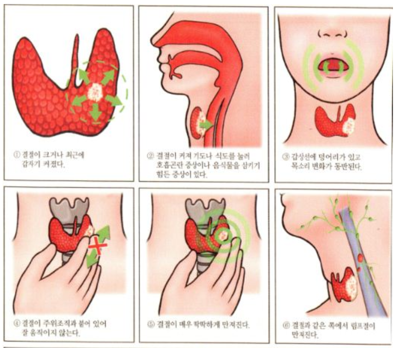 일단 증상이 나타났다는 것은 이미 많이 진행되고 있다는 것을 의미합니다.정기적인 검진만이 갑상선암을 조기에 발견할 수 있는 방법입니다.
