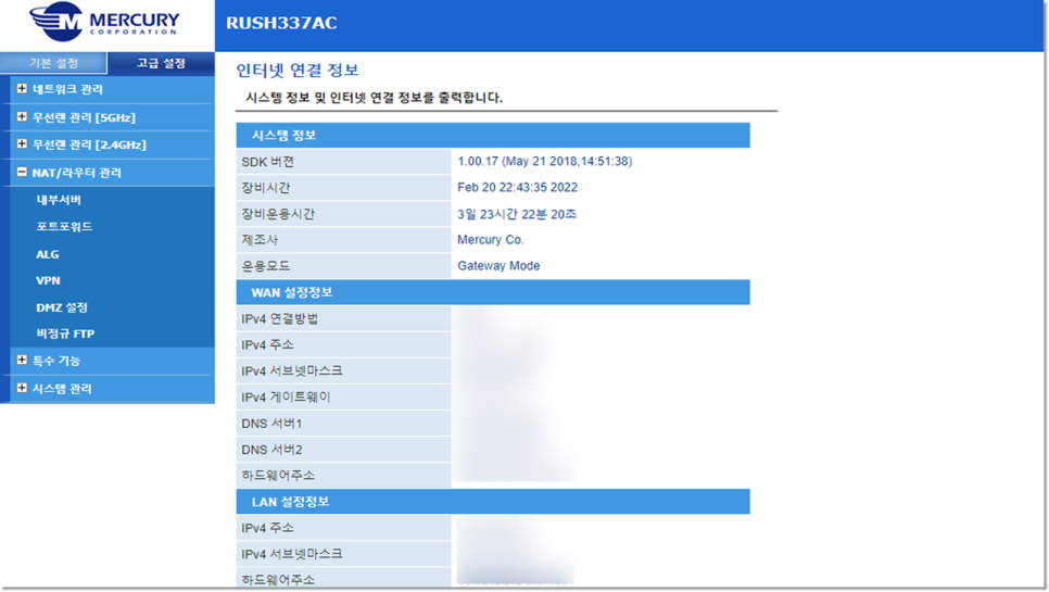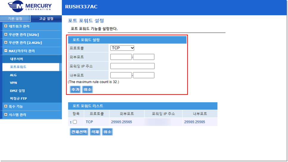 로그인이 완료되면 포트 포워딩 설정으로 들어가세요. 대부분 고급 옵션 부분에서 확인 할 수 있습니다.