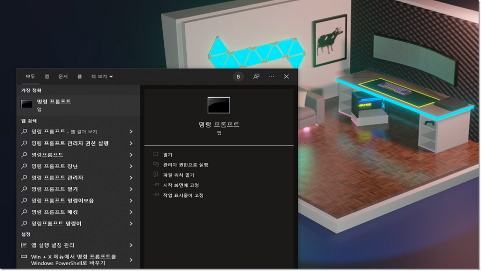 포트 포워딩을 진행하려면 가장 먼저 자신의 라우터 설정 페이지로 이동해야 합니다. KT, SKT, LG U+ 그리고 Iptime 까지의 모든 라우터는 별도의 사이트를 통해 세부 설정을 진행할 수 있도록 제공합니다. 제조사와 모델에 따라 약간의 방법만 다를 뿐 모두 동일한 모습을 보이고 있지만, 윈도우 검색창에 CMD를 입력하고 명령 프롬프트를 실행하면 됩니다.
