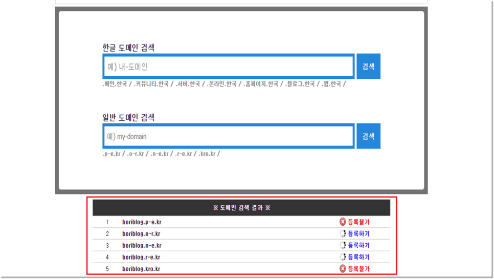 검색결과가 나타나면 우측에 등록가능여부가 표시됩니다. 이미 누군가가 해당 도메인을 사용하고 있다면 설정이 불가능하지 않으면 추가할 수 있지만 맨 오른쪽에 있는 등록을 클릭합니다.