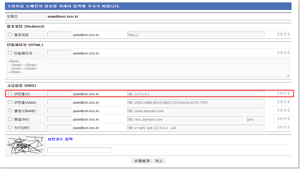 도메인 등록이 완료되면 상세 설정을 진행할 수 있습니다. 여기서 수정해야 될 부분은 단 하나 IP 부분인데 고급 설정 부분에 있는 IP 접속을 체크해 주세요. 마지막으로 오른쪽 란에 내 IP 주소를 쓰고 수정하기를 클릭하면 마인크래프트 도메인 설정까지 완료합니다.