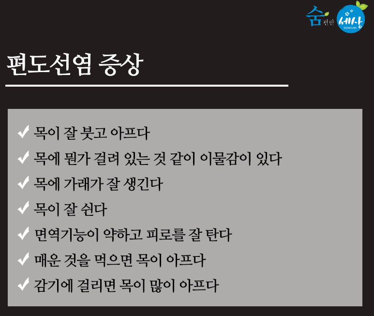 편도선은 컨디션에 민감하게 반응하는 곳이므로 평소 무리한 활동, 스트레스를 피하는 것이 좋습니다.