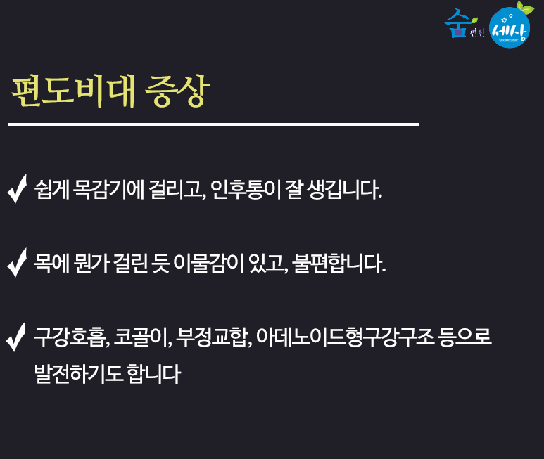 면역기능을 높이는 치료와 함께 호흡기도 확보한 후 구강호흡을 교정해야 합니다.
