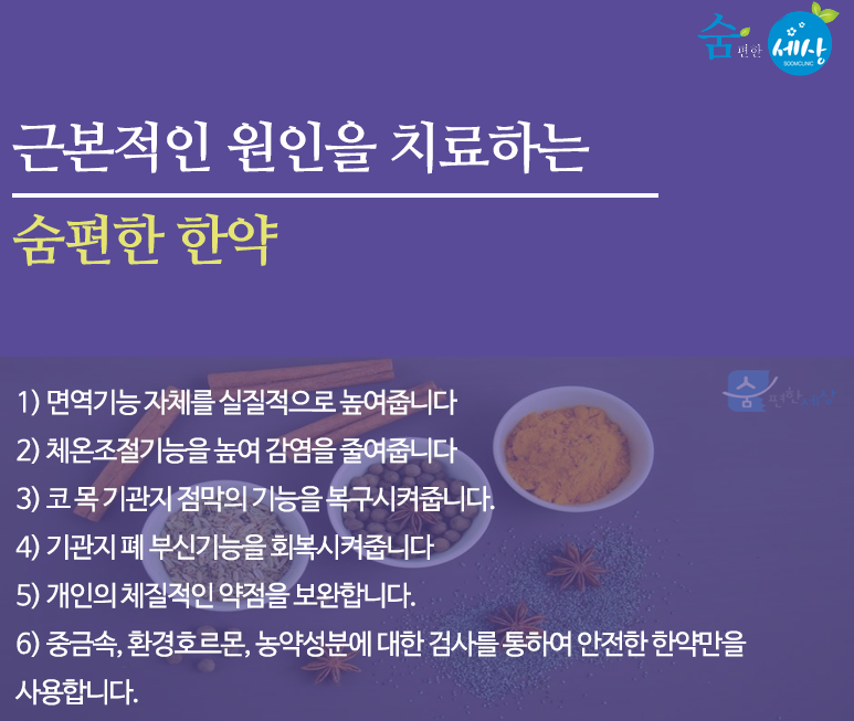 숨쉬기 편한 세상의원의 한방치료는 면역기능을 높이고 체온조절기능, 기관지폐기능 상승, 기도확보, 구강호흡교정치료를 시행합니다.