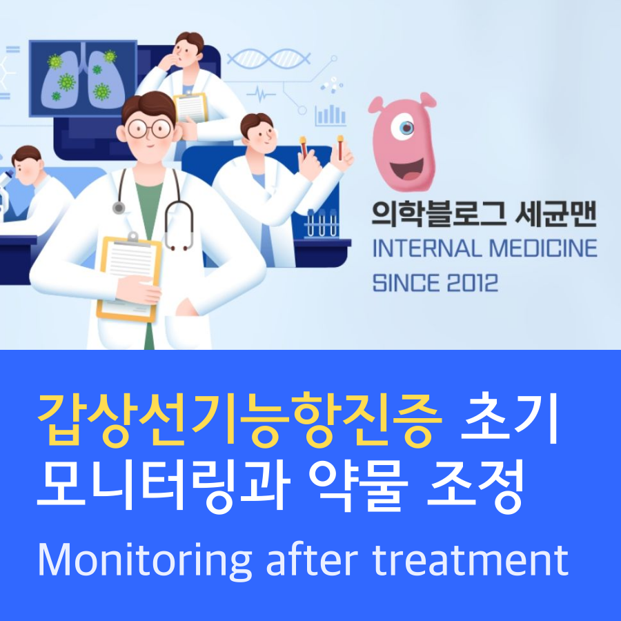 갑상선 기능 항진증에서 thionamides, radioiodine, surgery의 어느 치료를 사용해도 초기 모니터링은 주기적인 임상 평가와 혈청 freeT4및 자주 위원 T3수치 측정으로 구성되어야 합니다. 혈청 TSH농도는 환자가 갑상선 기능 항진증에 빠진 뒤 몇주간 낮게 유지할 수 있으며, 갑상선 기능 저하증에 걸린 환자에서 일시적으로 낮게 유지되는 것이 있으므로 주의해서 해석해야 합니다.