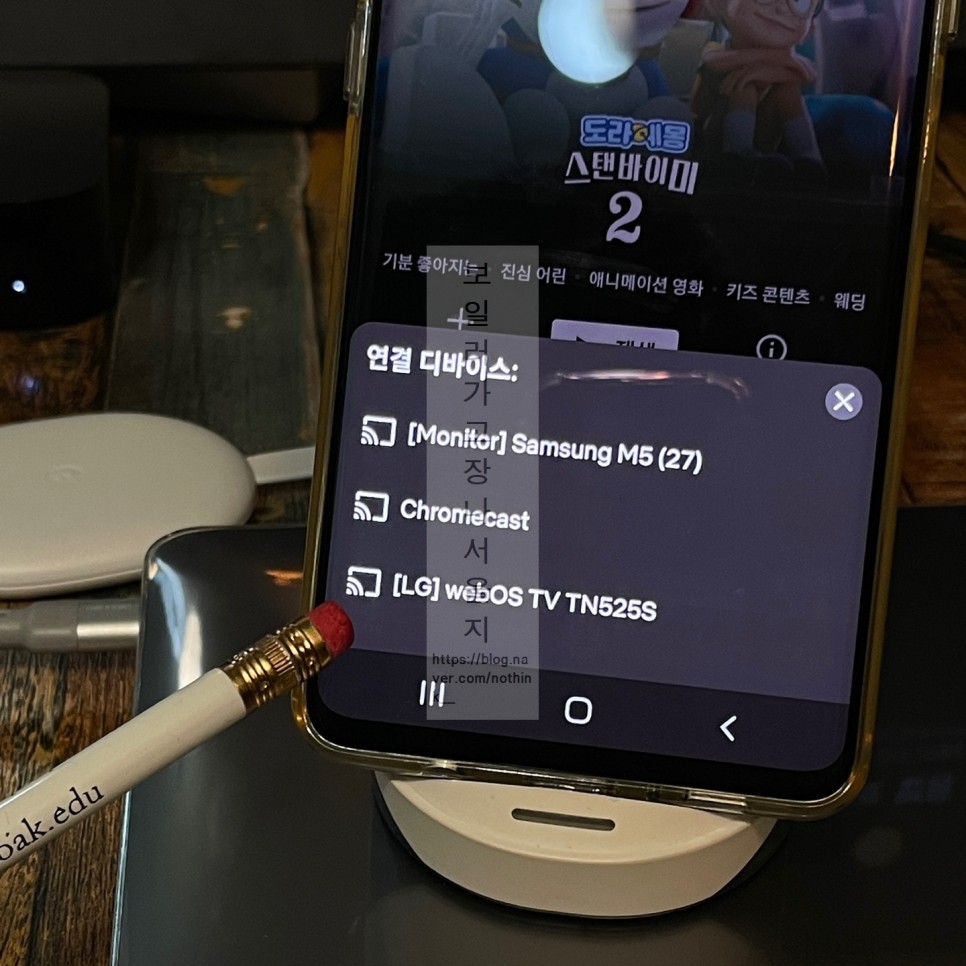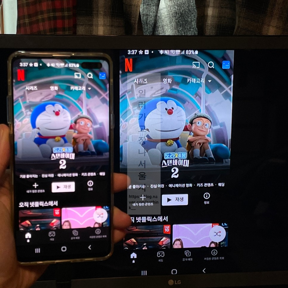 그러면 위와 같이 TV에서는 영상이 송출되고 스마트폰의 경우 리모컨 형식으로 사용이 가능합니다. 이 방식으로 미러링을 했다면 스마트폰은 넷플릭스 앱을 벗어나 다른 앱 사용도 가능합니다.