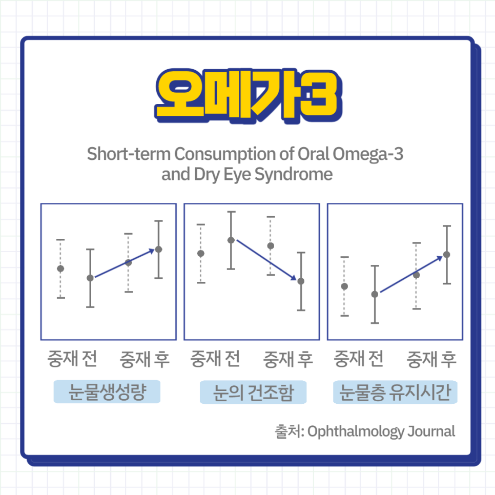 따라서 오메가3 섭취를 통해 눈의 유수분의 균형을 되찾는 것이 필요합니다. 오메가3를 섭취하도록 한 인체 적용 시험에서는 눈물의 생성량과 눈의 건조 정도, 그리고 눈물층의 유지 시간이 각각 개선된 것을 확인할 수 있었습니다.