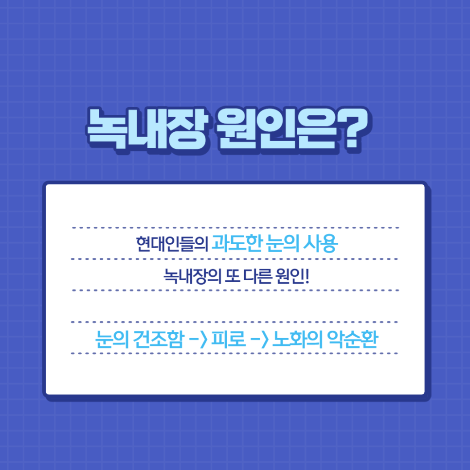 이 밖에도 현대인의 경우 전자기기의 과다 사용으로 인한 눈의 건조와 피로, 그리고 노화의 악순환도 녹내장의 원인이 될 수 있음을 명심해야 합니다. 전자 기기를 사용할 때는 대량의 정보가 들어와 처리를 위해 눈꺼풀의 깜빡임이 줄어듭니다. 이 때 건조한 눈은 시야가 흐려지면서 상이 흔들리게 됩니다. 이를 바로잡기 위하여 눈의 근육을 과도하게 움직이면 피로가 쌓이고 안구의 안압상승, 그리고 노화가 가속화되어 녹내장, 황반변성 등의 심각한 문제가 발생할 수 있습니다.
