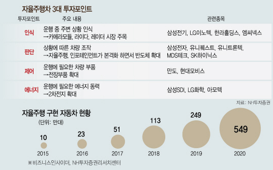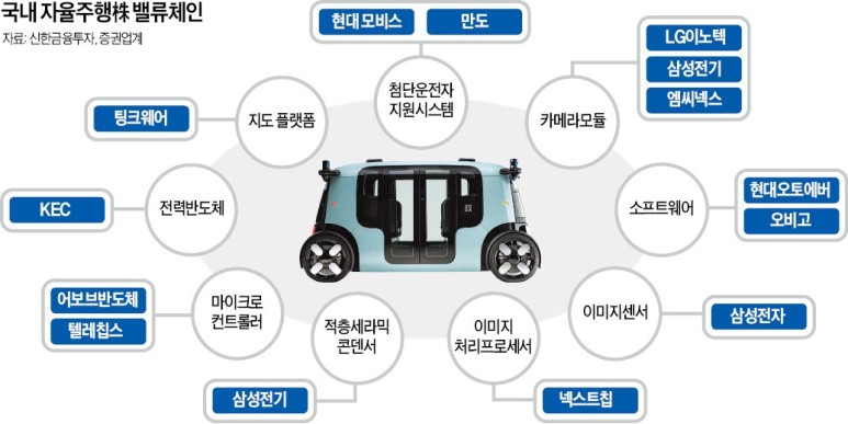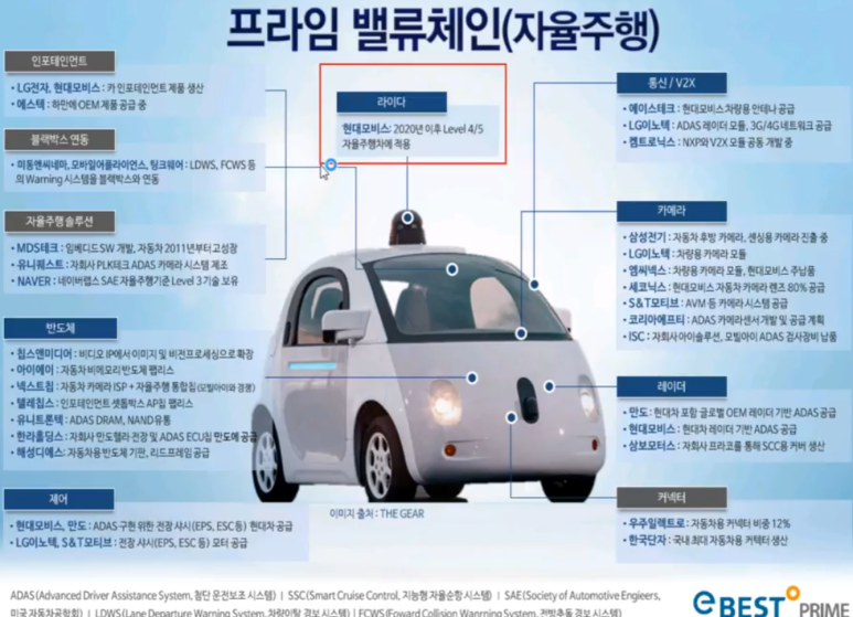 ◆이외에도 자율주행자동차의 핵심기기가 있는데요 한번 볼까요~ 자율주행기술의 주요기기내용 주행환경인식카메라, 레이더, 라이더센서를 사용하여 장애물, 도로표지, 교통신호등을 인식합니다.위치인식 및 맵핑 HD맵, 고정밀 위성측위기기 HD맵, GPS, 센서융합을 통해 차량의 절대/상대위치를 추정합니다.판단 ECU, ADAS, DCU인 신호를 효율적으로 처리하여 차량의 행동을 지시합니다.제어 스마트 액추에이터 지시된 행동을 따라가기 위해 조향, 가감속 등을 제어합니다.인터랙션HVI, V2X통신차량과 운전자, 차량과 주행환경이 서로 정보를 교환합니다.