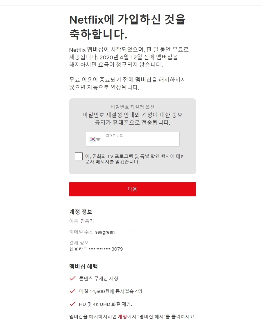 넷플릭스 등록 축하 멘트와 함께 30일 무료 이용기간이 종료되는 날짜를 알려드리겠습니다 아래는 멤버십 관련 아이디, 결제정보, 요금제도 다시 확인할 수 있습니다. 중간에는 만약 비밀번호를 재설정해야 할 경우를 대비해 휴대폰 번호를 입력하시고, 혹시 스팸 메일이 오는 것이 싫다면 아래쪽의 사각상자는 체크하지 않은 상태에서 다음과 같이 진행합니다.