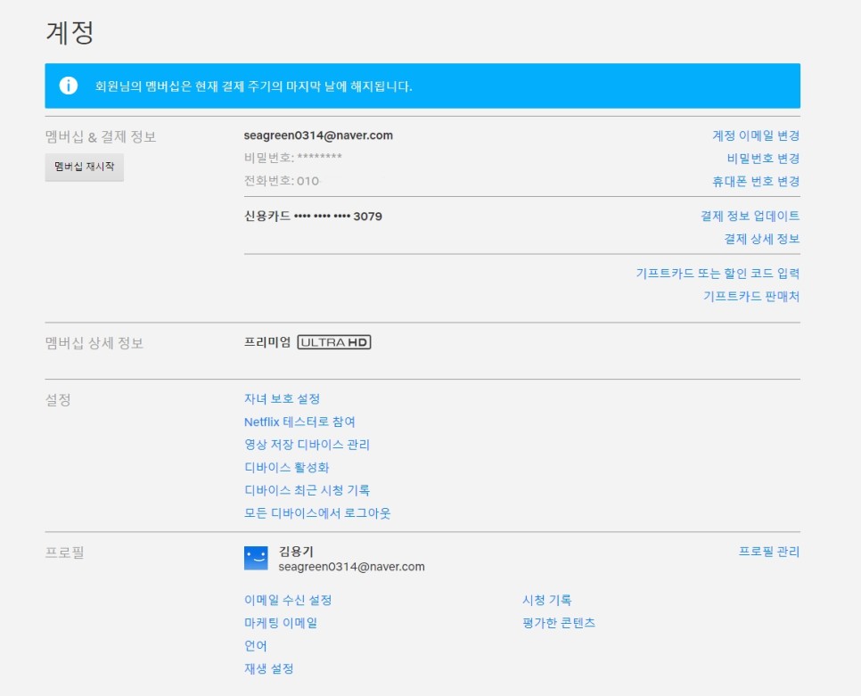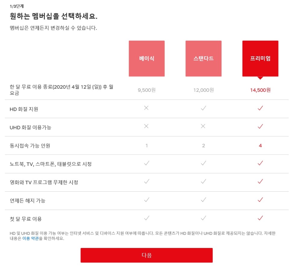 요금제를 멤버쉽이라고 표현하고 있으며 베이직 / 스탠다드 / 프리미엄에서 선택할 수 있습니다. 실제로 결제하여 사용하는 경우라면 고민하는 시간이지만, 무료로 사용할 수 있는 기간이니 당연히 프리미엄을 선택하는 것이 좋습니다. 나중에 실수해서 해지하지 않으셨으니 결제하실 금액이 부담스러우시다면 걱정하지 마세요. 포스팅 후반부에는 해결책이 있습니다. 따라서 무료 기간에는 TV로 보는 경우 UHD 화질에 대응하는 프리미엄에 가입해 주시기 바랍니다.