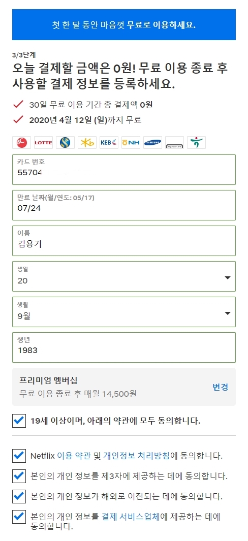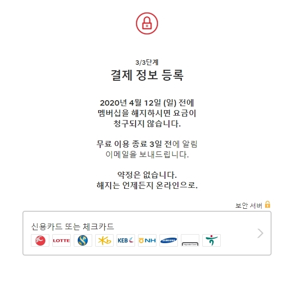 이제 마지막 3단계네요. 여기에서는, 지불 정보를 등록합니다. 실제 사용 가능한 신용카드 또는 직불카드를 등록하고 약관에 모두 동의해야 다음 넷플릭스 등록이 완료됩니다. 1단계에서 강조했던 요금 청구에 대한 안내 문구를 다시 한번 강화해서 다양한 표현으로 보여줍니다. 약정없이 언제든지 해약하라. 오늘의 결제 금액은 0원이며, 언제까지 무료 이용 가능 요일까지 표기됩니다. 이 정도면 충분히 안심이 되겠죠?