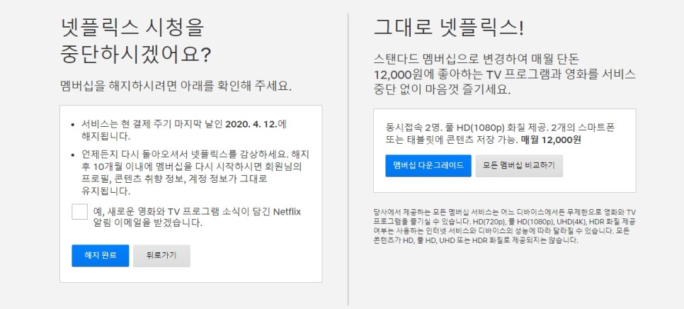 멤버쉽이 해지된 것을 확인하여 보다 나은 서비스를 제공하기 위해 멤버십을 취소한 이유를 체크합니다. 과연, 여기에서 체크하는 데이터를 얼마나 사용하는지는 모르겠지만, 간단하게 저는 가격이 부담된다고 체크했습니다. 솔직히 2~4명이 모여 하나의 멤버십을 이용하면 커피 한 잔 값으로 해결할 수 있지만 혼자 이용할 경우 화질을 위해서라도 스탠다드(12,000원) 이상을 선택하기 때문에 자주 보는 입장이 아니면 좀 부담스럽다고 생각합니다. 아무튼 이렇게 하면 넷플릭스 해지가 끝납니다