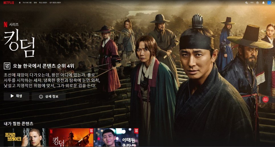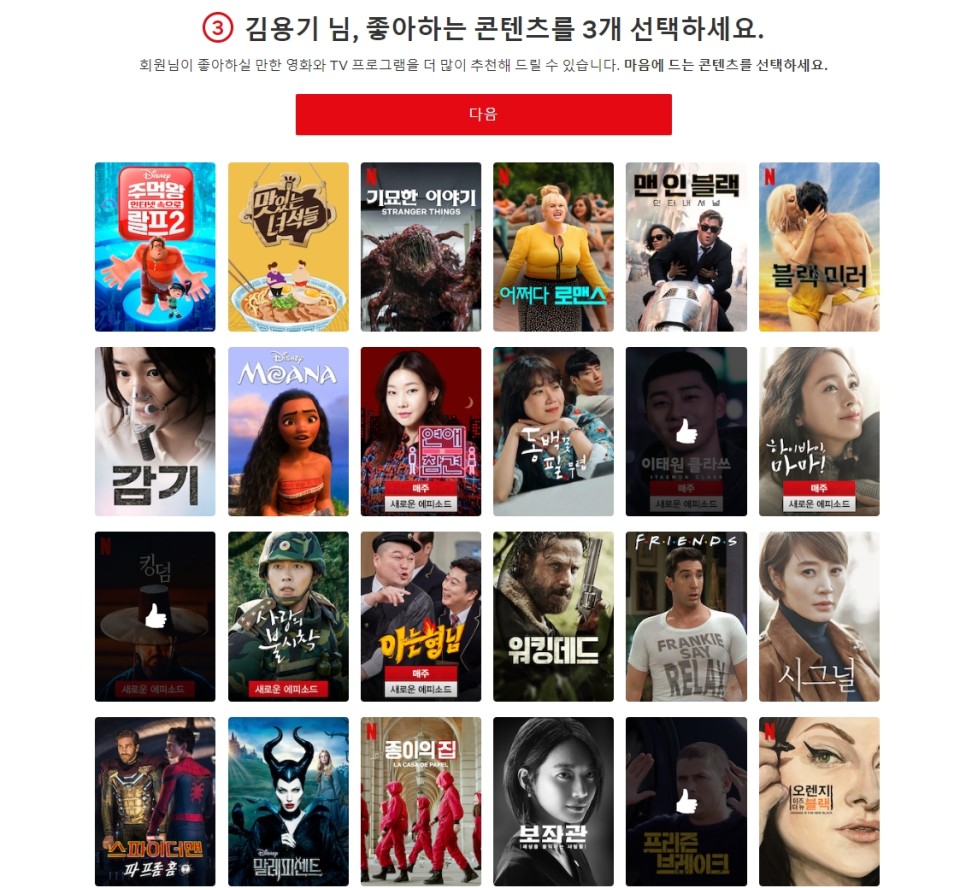 이제 정말 마지막으로 영화, 예능, 드라마 등 다양한 작품 중 원하는 콘텐츠 3개를 선택합니다” 사용자들이 선호하는 콘텐츠를 제공하는 것이 목적이므로, 여기에서는 가능한 한 실제로 본인이 재미있게 감상하거나 흥미 있는 작품을 선택하는 것이 좋습니다. 저는 요즘 즐겨보는 ‘이태원크래츠’와 ‘킹덤’, ‘프리즌브레이크’를 선택했습니다. 아무튼 작품 3개를 뽑아서 다음으로 넘어가면 드디어 넷플릭스를 마음껏 즐기실 수 있습니다
