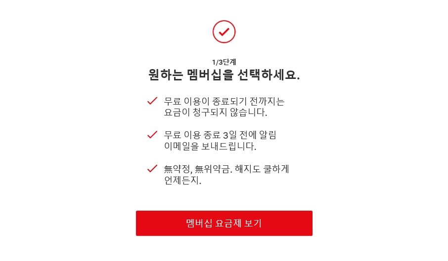 가입하시는 누구든지 가입만 하시면 30일간 무료로 이용하실 수 있습니다. 스마트폰이나 태블릿, 노트북 등 기기에 관계 없이요. 넷플릭스의 가입 수속은 매우 간단합니다. 아이디가 이메일 주소이기 때문에 이메일 주소를 입력하고 시작을 하도록 하겠습니다. 첫 번째 단계는 요금제를 선택하는 것인데, 소비자들이 가장 불안해하는 자동결제를 안심시키기 위해 무료 이용 종료 전에 요금을 청구할 수 없으며, 3일 전에 알림 메일을 발송하여 언제든지 쿨하게 해지해도 된다는 문구가 먼저 표시되어 있습니다.