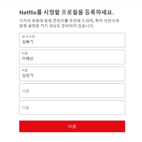 가입은 간단하게 끝났지만, 실제로 서비스를 이용하기까지는 프로세스가 조금 남아 있습니다. 우선, 넷플릭스를 시청할 기기를 선택할 것입니다만, 모두 체크해도 되나요, 하나만 체크해도 좋네요. 큰 의미는 없는 것 같군요. 그리고 최대 5명까지의 프로필을 등록하며, 12세 이하의 어린이 프로필의 경우 어린이 설정이 가능합니다. 이 부분도 귀찮으시면 대충 넘어가셔도 됩니다.