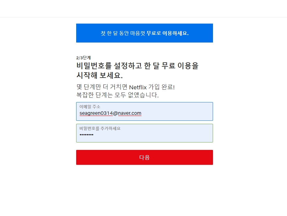두 번째 단계는 계정 경로 설정입니다. 보통 어떤 사이트에 회원가입을 할 때 잘못 입력하는 것을 막기 위해 비밀번호를 2번 입력해서 확인하는데 넷플릭스에는 간단하게 만든 것이 단 1번만 입력되도록 되어 있습니다. 그래서 정확하게 입력하고 넘어가야 합니다. 물론 여기에서 오자 탈자가 일어나도 나중에 비밀번호를 찾으면 됩니다만, 귀찮으니까요.
