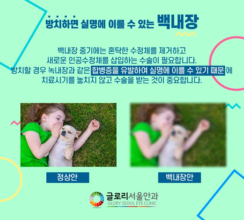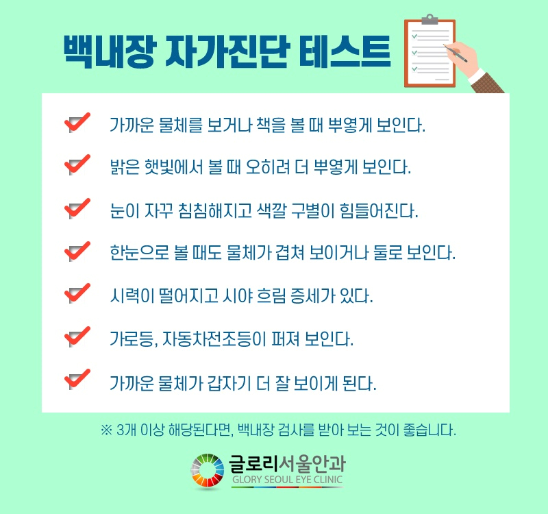 사물이 이중으로 겹쳐 보이거나 물체의 색상을 구분하기 어려운 증상, 밝은 곳보다 어두운 곳에서 오히려 시력이 좋아지는 증상, 햇빛이 넓어 보이는 증상이 발생하는 경우 백내장을 의심해 볼 필요가 있습니다. 특히 원래는 돋보기를 착용해야 할 정도로 근거리 시력이 좋지 않았는데, 최근 들어 갑자기 좋아진 경우 백내장 말기 증상에 해당하므로 수술을 권장하고 있습니다.