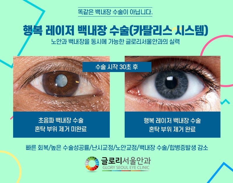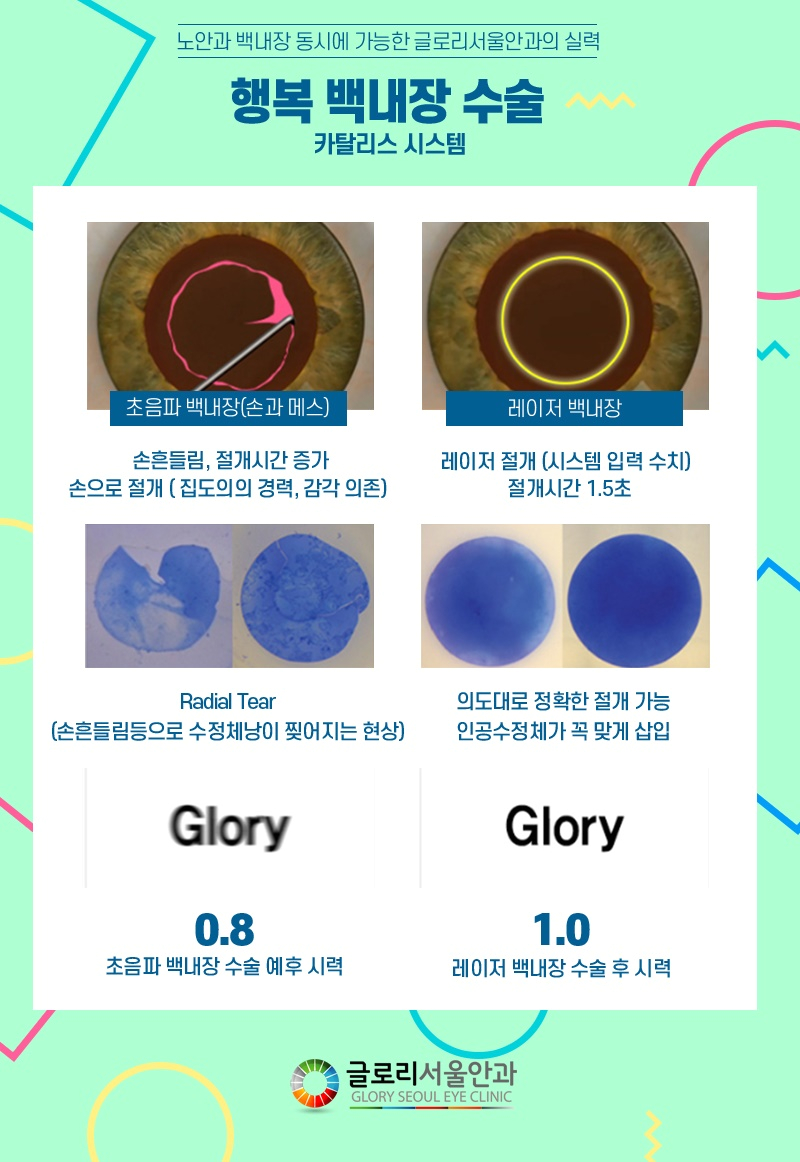 최근의 치료는 과거의 수기 방식에서 벗어나 레이저로 이루어지지만 카탈리스 레이저는 정확성과 안정성을 갖춘 장비라고 할 수 있습니다.무려 마이크론 단위까지 측정할 수 있을 정도로 정교한 개선을 지원하는 기기로서 개선시간이 짧고 통증정도도 줄어 만족도가 높습니다. 뿐만 아니라 내장된 입체 CT 촬영을 통하여 실시간으로 안구의 정보를 수집·반영하여 오차를 줄였지만, 이와 함께 각막 내피세포의 손상을 줄여 각막 부종, 각막 혼탁 등의 부작용이 거의 나타나지 않는 백내장 치료법입니다.