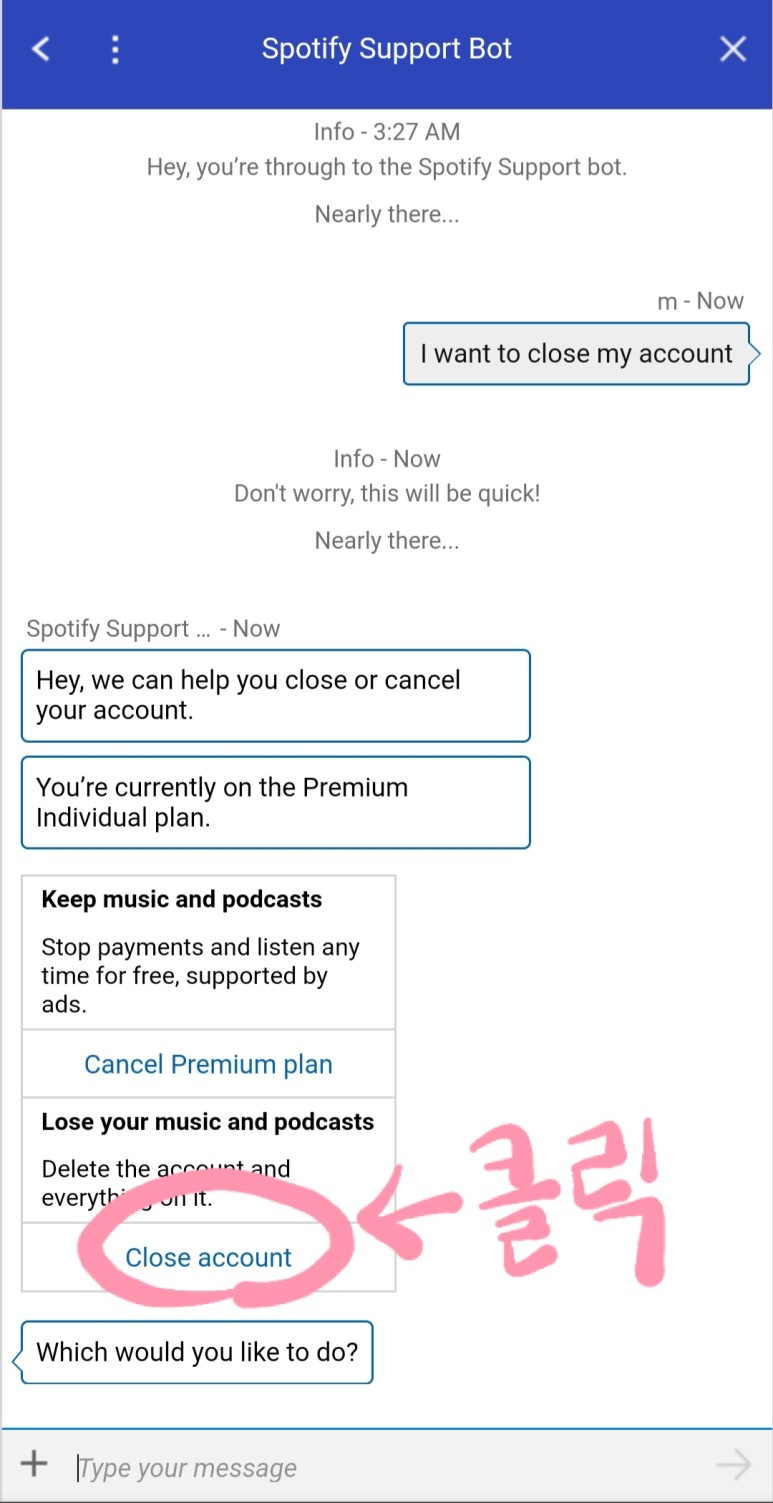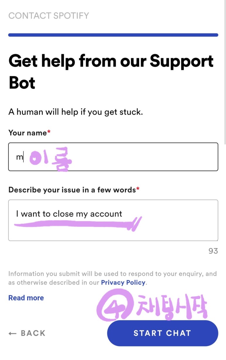 이름을 아무거나 쓰고 ㄱㅈ 두번째 칸에는 Iwanttoclosemyaccount 쓰고 STARTCHAT 클릭
