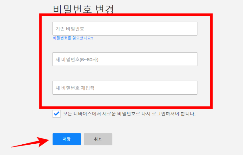 (6) 이후 기존 비밀번호를 적어두고 기억할 새로운 비밀번호를 기록한 후 저장을 클릭하여 넷플릭스 비밀번호 변경을 완료하십시오.