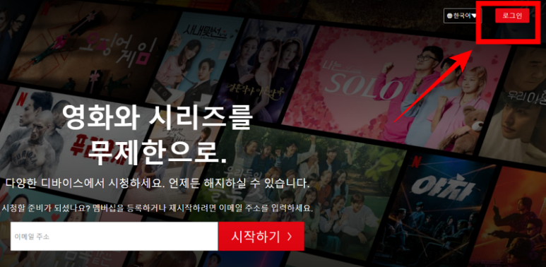 (1) 먼저 넷플릭스 공식 홈페이지에 접속한 후 화면 우측 상단 아이디로 로그인 버튼을 눌러 입장합니다.