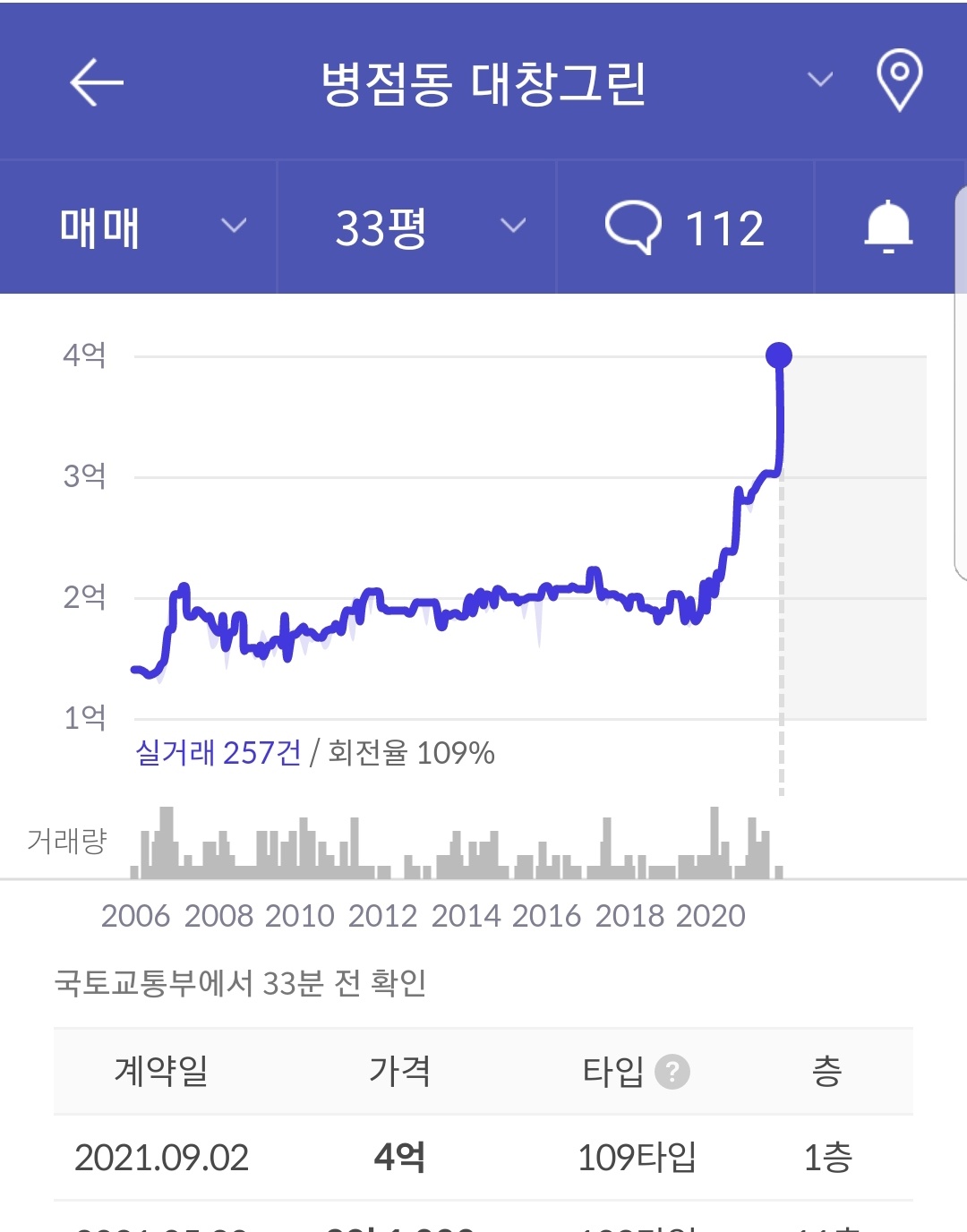 33평형의 최근 거래내역을 확인해보면 2022년 8월 본건과 같은 4층이 3억5,000만원에 거래된 것으로 실거래가에 나와 있습니다.