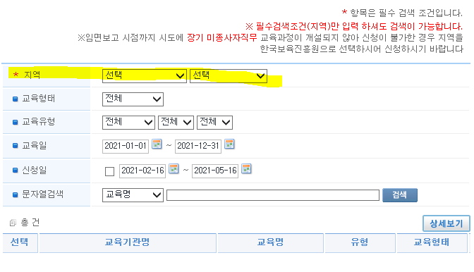여기에서 본인이 신청할 수 있는 교육의 ‘사각체크박스’를 체크하고 ‘상세보기’를 클릭해주세요!