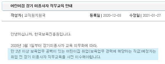 2년 이상 보육교사로 근무하지 않았다면 ‘장기 미종사자 교육’을 이수하고 취업전선에 뛰어들어야 한다는 사실ㅠㅠ