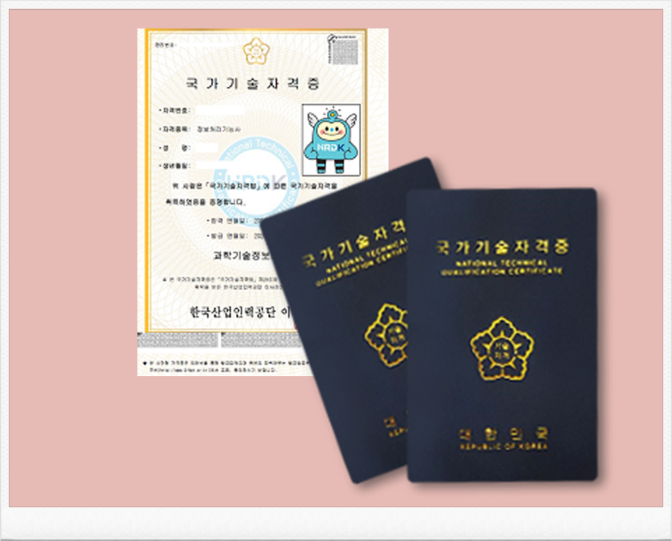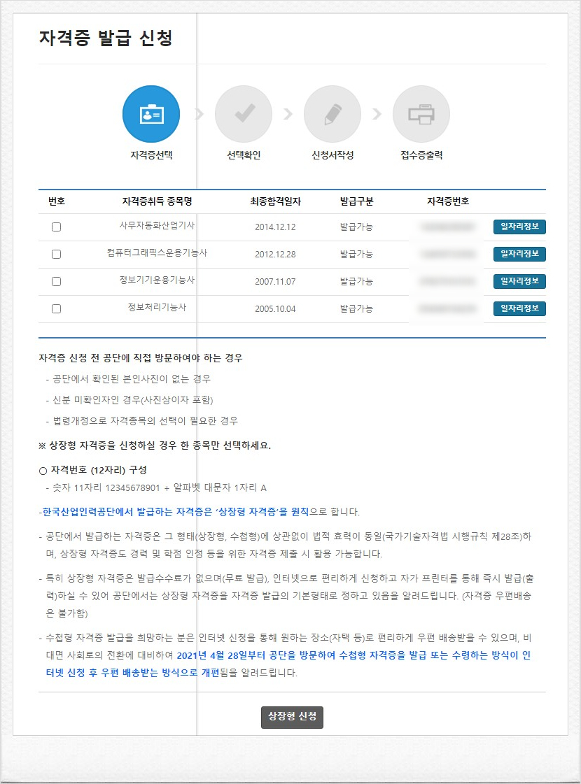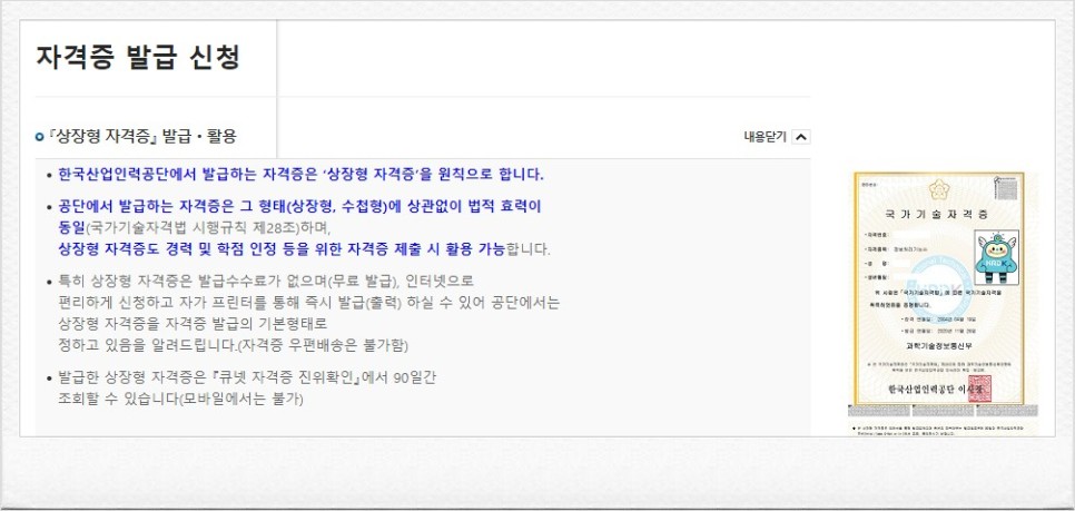 자격증 발급 신청 시 상장형 자격증을 원칙으로 하고 있는데, 요큐넷 자격증 사본 출력이 상장형 출력이며, 공단이 발급하는 자격증은 그 형태와 관계없이 동일한 법적 효력이 적용됩니다.