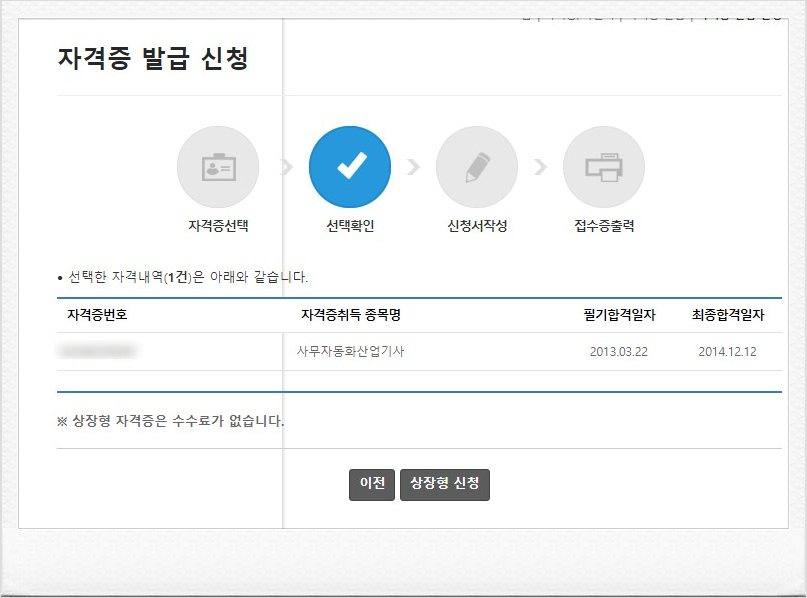 자격을 선택한 후 상장형 신청을 누르면 다시 확인할 창이 나타납니다.원하는 자격증이 올바른지 확인한 후 상장형 신청을 클릭합니다.