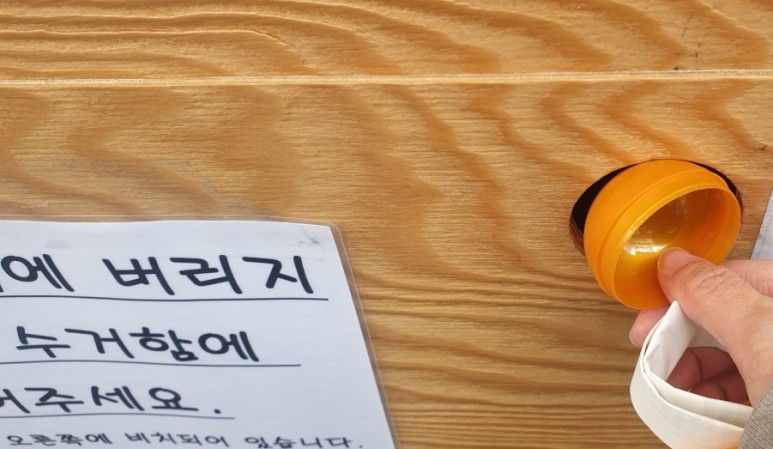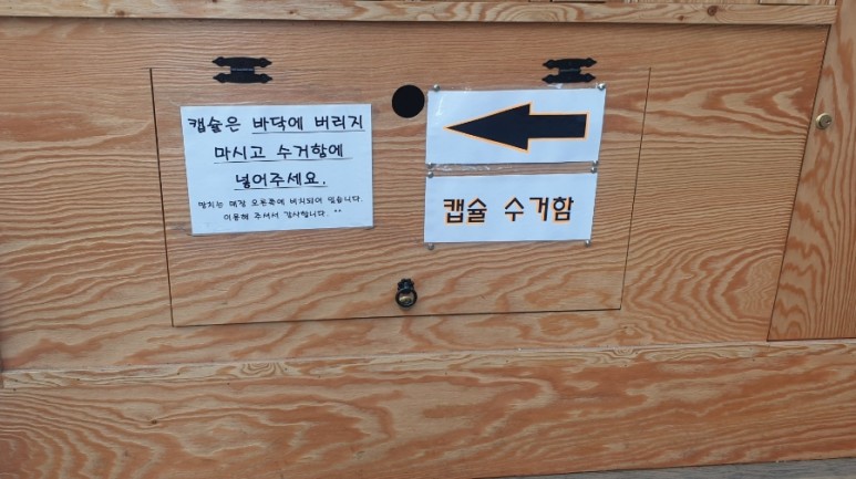 캡슐은 바닥에 버리지 않고 수집함에 넣어 달라고 하고 있습니다.나는 수집함에 쏙~