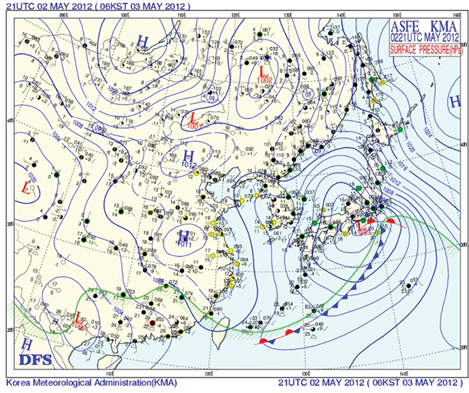 1 시뮬레이션을 통한 가상현상 분석 화산재 이동을 규명하기 위해 2012년 한 해 기상장을 이용하여 모의 시뮬레이션이 진행되었습니다. 기록과 같은 바람의 이동현상을 설명하기 위해 유사한 2012년 5월 21일 21:00 지상분석일기를 바탕으로 하고 있습니다. 날씨도를 보면 일본의 동쪽과 중국의 북부지방에 기압릉이 있고 한반도-만주 국경에는 온도곡을 동반한 기압골이 위치해 있습니다. 이 기압골은 일본 동쪽 기압의 능에 의해 동쪽으로 가지 못하고 우리나라 쪽으로 남진하면서 발달합니다.