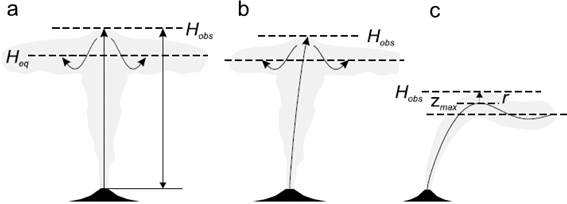화산재가 지면을 향한 이유로는 가벼운 화산재가 높이 솟지 않고 땅에 달라붙어 하강한 채 이동한 이유는 무엇일까요. 재구축 고도별 이동궤적을 모의실험하면 당시 바람 상황을 추정할 수 있습니다. 만약 화산이 폭발한 후 분화구 주변에 탁월풍이 우세하지 않으면(그림a), 화산재가 위로 상승하여 성층권으로 진입하고 이후 제트기류를 타고 이동합니다. 그러나 분화구를 가로지르는 지상풍이 우세하다면(그림c), 분화구에서 상승하는 화산재는 대류권에서 구부러진 형태로 분포되어 바로 성층권으로 진입하지 못하고 탁월풍을 타고 휘면서 지면으로 향하게 된다고 합니다.