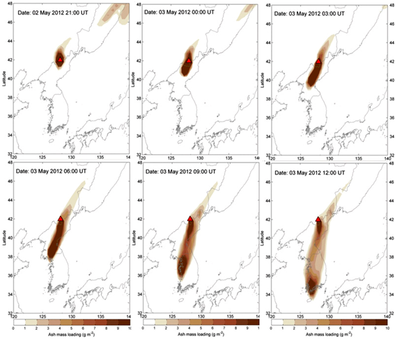 2012년 5월 2, 3일 실시간 기상장에서 백두산이 폭발했다고 가정하고 모의 시뮬레이션을 해본 결과는 다음과 같습니다.