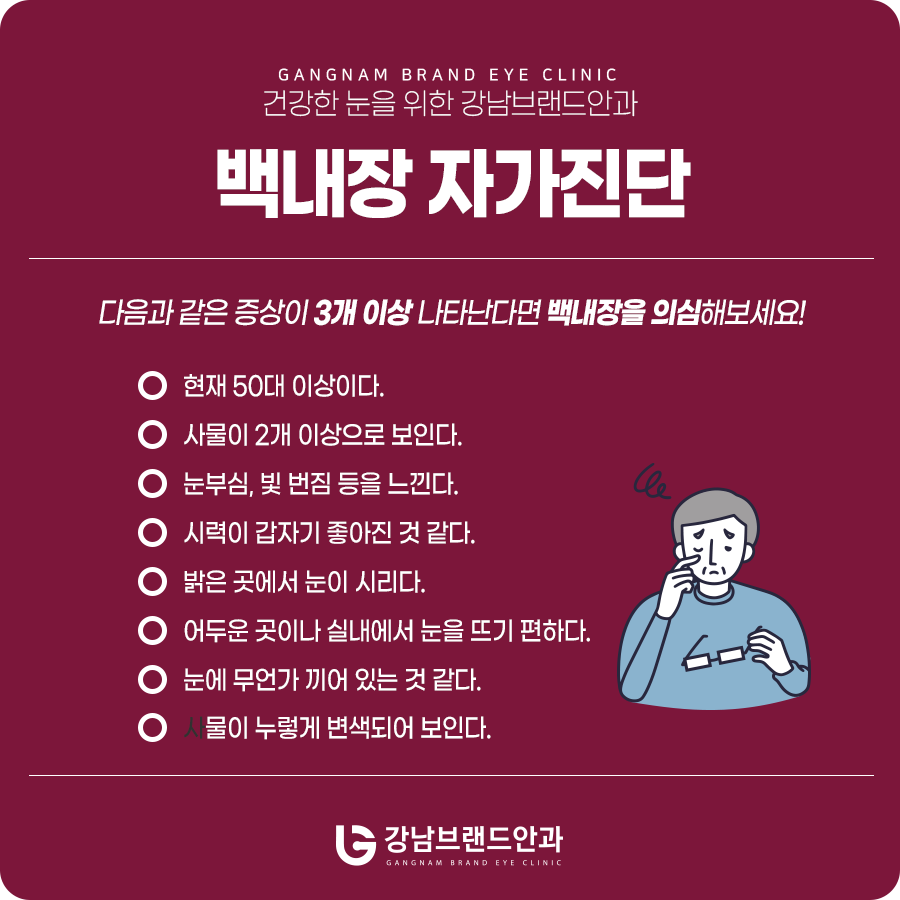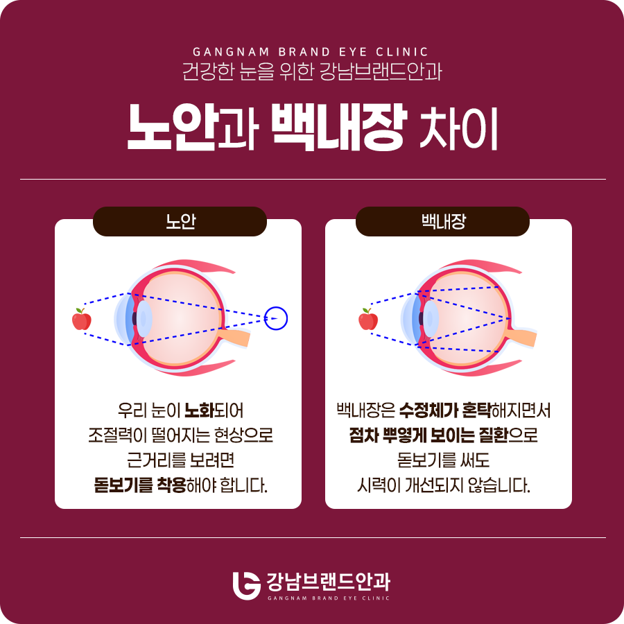 하지만 이 둘은 전혀 다른 문제라는 것을 인지해 두어야 했습니다. 노안은 형체근의 노화가 시작되면서 생긴 문제였습니다. 반면 백내장은 수정체의 혼탁 정도가 심해져 녹내장과 같은 합병증이 생기거나 치료 시기를 놓치게 되면 실명까지 이어지는 위험한 상황에 놓일 수 있어 반드시 정밀검사를 받아야 했습니다.