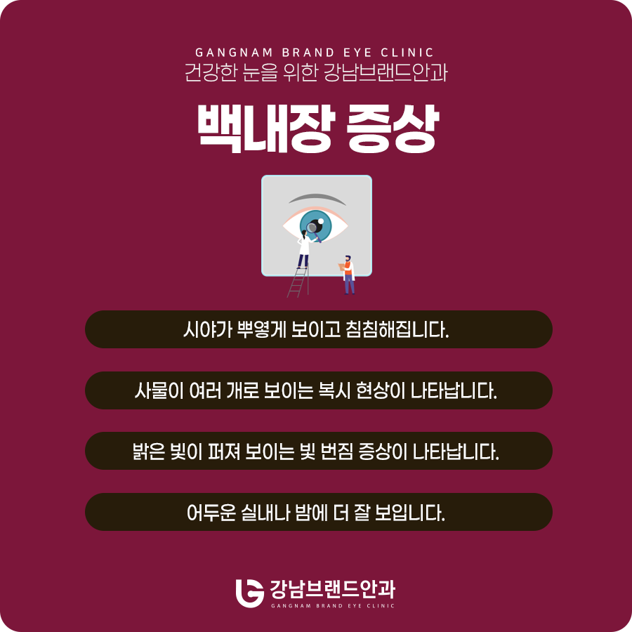 백내장은 수정체에 부분적인 혼탁이 있어 한쪽 눈으로 바라볼 경우 사물이 여러 개로 덮이는 복시 증상을 느낄 수 있습니다. 또한 시력저하도 나타날 수 있으며 낮에는 눈부심 증상이 동반되는 경우가 많았으며 백내장 정도에 따라 낮이나 밝은 곳보다는 어두운 곳이나 밤에 잘 보이는 경우도 있었습니다.