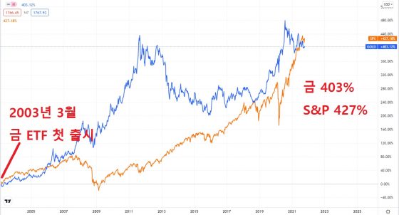 금 ETF 등장 이후 금값 추이 (자료=블룸버그) 디지털 자산시장의 많은 전문가들이 이 그래프에 대해 “비트코인도 금처럼 장밋빛 미래가 있다”고 말하고 있습니다.정말 그럴까요?#차트가 감추고 있는 것과 행복회로를 바꾸는 이 차트는 오해가 있습니다. 사실은 아주 중요한 요소를 숨기고 있어요.금에 투자하는 투자자, 특히 기관투자가의 생각을 완전히 반영하지 못하고 있습니다.같은 차트 위에 #S&P500 지수를 올려놨어요”2003년 3월 이후 현재까지 금값이 403% 올랐고, S&P500은 427% 올랐습니다”